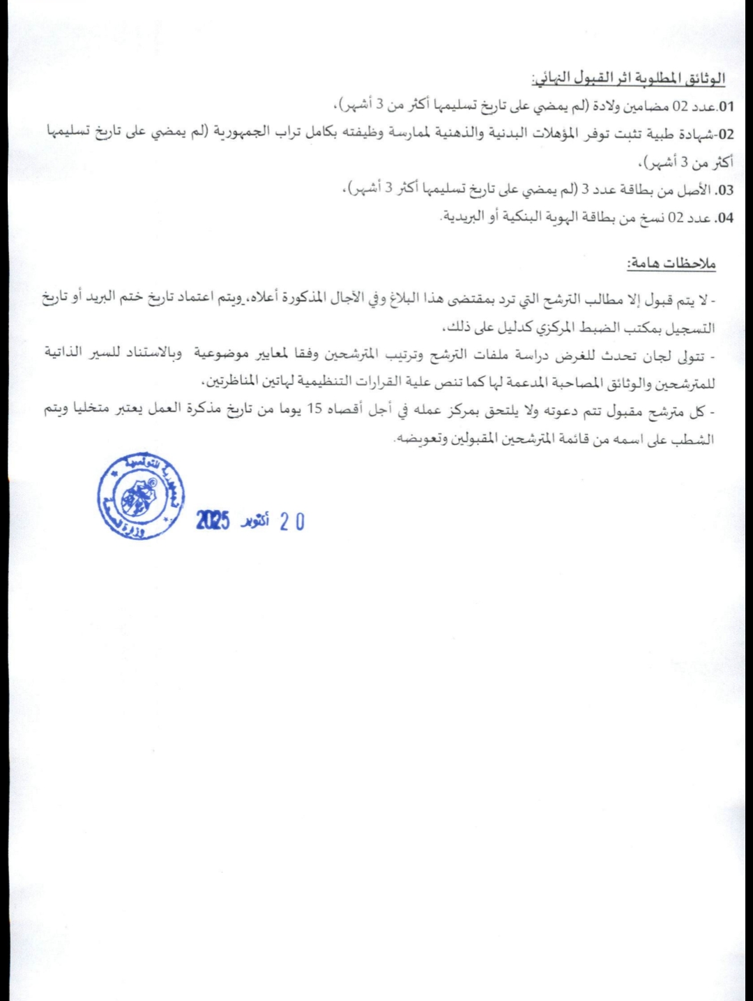 - شهادة طبية (أقل من 3 أشهر) تثبت توفر المؤهلات البدنية والذهنية لممارسة الوظيفة بكامل تراب الجمهورية.