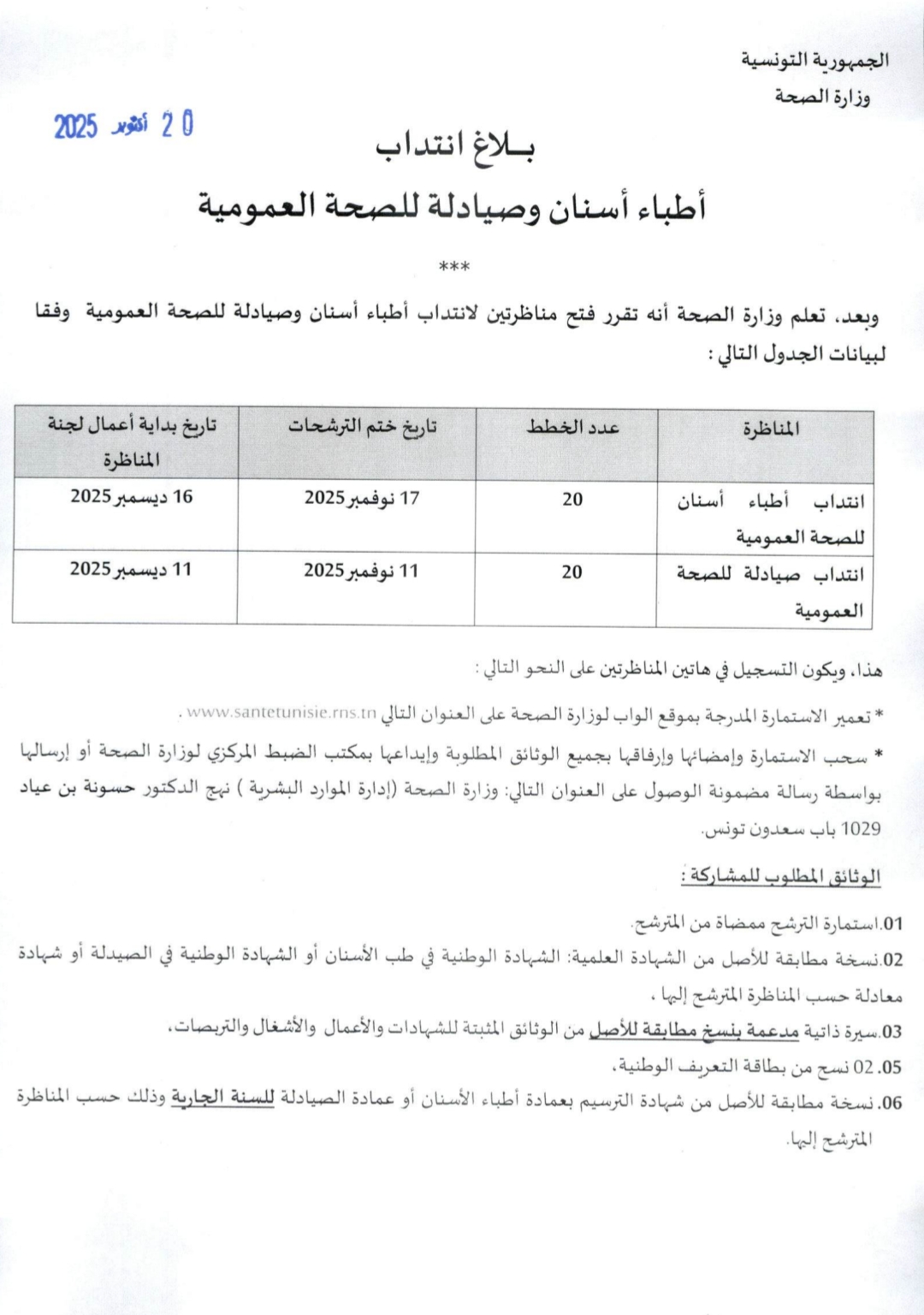 أعلنت وزارة الصحة التونسية عن فتح مناظرتين لانتداب أطباء أسنان وصيادلة للعمل بالصحة العمومية. نُشر هذا البلاغ بتاريخ 20 أكتوبر 2025، ويوضح تفاصيل الخطط المفتوحة، آجال تقديم الترشحات، والشروط والوثائق المطلوبة.